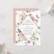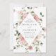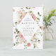 Bröllopbjudanden för blommigt i elegant som innehåller uppgifter om namn och bröllop omgivna av ett geometriskt ram av rosor i vattenfärg i skuggor av rosa och dammig ro med lush grönt löv. De romantiska bröllopsinbjudningarna i ro är perfekt för vår och sommarträdgårdsbröllop!