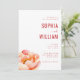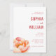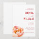 Denna eleganta bröllopsinbjudan har en ren, vertikal layout med en harmonisk balans mellan text och illustration. Designen visar mjuka rosa peonior till vänster, renderade i en akvarellstil som tillför en romantisk touch, medan den högra sidan presenterar fet, versal serif-typografi i en djupröd nyans för namnen, vilket skapar en iögonfallande mittpunkt. Anpassningsbara platshållare möjliggör personlig anpassning av datum, tid och plats, vilket säkerställer mångsidighet för alla firanden. Den övergripande stämningen är sofistikerad och varm, perfekt för par som söker en inbjudande men ändå raffinerad estetik för sin speciella dag.
