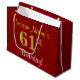 Denna enkla, eleganta födelsedagspresentpåse har ett personligt meddelande som "CustomNames 61-årsdag!" (med "61" i en imitation av guldliknande färg) på en röd bakgrund. Namnet är i ett manusliknande, guldfärgat typsnitt och kan anpassas. En personlig födelsedagspresentpåse som denna kan kanske användas när man ger en present eller gåva till någon som firar sin sextioförsta födelsedag.