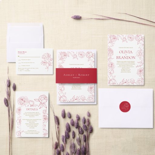 En röd påsklilja linje ritning gör ett elegant uttalande för ditt bröllop. Du kan anpassa med din information och ändra färgen för att passa din händelse.