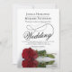 Denna vackra bröllopsinbjudan innehåller ett fantastiskt foto av ett enda långt, härdat röd ros som ljuger på sidan och reflekterar i bassäng i vatten med vinkara och kramper. Utformningen har ett kalligrafiskt skript i finare med ett långt kort svan skapar det både modernt och klassiskt. Elegant, sofistikerad och chic till inbjudan för dina vänner och din familj till på din speciella dag. På baksidan av kortet finns en QR-kod för webbplatsen bröllop och en kort anteckning som instruerar folk att besöka webbplatsen för mer information och OSA.