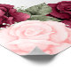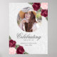 Elegant akvarell blomsterfoto minnesmärke/begravnings välkomstskylt med ett foto prytt med röda och rosa rosor och baby's breath blommor på en botanisk mönstrad bakgrund.