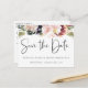 Eleganta akvarell rosablommiga och plommonlila blomsterarrangemang, bröllop spara datum postkort. Kortet har elegant kalligrafi "Spara Datum", på framsidan och baksidan.