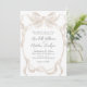 Bröllopsbjudan till Ecru Ribbon. Ställ in scenen för en tidlös och elegant firande med den här klassiska vintage-inspirerade designen. En mjuk, benvit eller kru vattenfärgsbuk med flytande rosett band lägger på ett snyggt sätt ovanpå, och lånar ut en luft av underskattad sofistikering och charm från den gamla världen. Bröllop-detaljerna visas elegant i ett subtilt ovalt ram, skrivet i förfinat handskrivet grått-manus typsnitt som framkallar en känsla av tradition och romantik. Den här utformningen fångar den klassiska skönheten med en vintage, skapar den perfekt för bröllop, formella svarta affärer eller intimt EU-inspirerat firande. Toner och delikat grått-typografi skapar ett varmt och inbjudande estetiskt ämne som exuderar raffinering och nåd. Med den här inbjudan kan du anpassa texten, typsnitt och layouten till bröllop-temat, om du vill ha anpassadet fullt ut. Den här designen är tillgänglig som en utskriven inbjudan eller en hämtningsbar digital fil och kombinerar elegans med vintage för att skapa ett verkligt oförglömligt första intryck för din speciella dag.