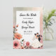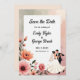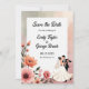 Den här blommigten med elegant vattenfärg sparar datumet inbjudan är perfekt för ett modernt bröllop. Den romantiska designen har en elegant vattenfärgsbild i ram med en blommigt med brud- och groombild och svart kalligrafi på vit bakgrund.