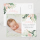 Vi presenterar elegant foto rosablush blomster födelse meddelande vykort. Vacker akvarell blommor och elegant handskriven text. Del av en samling.