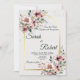 Romantisk, elegant och vackert balanserad - denna rosablommiga bröllopsinbjudan har mjuka rosa blommor, delikat grönska och en tidlös guldbåge.
