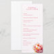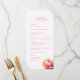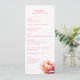 Denna eleganta bröllopsmeny har en vertikal layout med en mjuk pastellfärgspalett i ljust rosa och vitt, vilket skapar en sofistikerad och inbjudande atmosfär. Designen omfattar tydliga sektioner för förrätter, sallad, huvudrätt och efterrätt, där varje sektion framhävs med feta rubriker och ren serif-typografi. En stor, detaljerad blomsterillustration tillför en touch av realism och elegans på höger sida, medan gott om luft runt texten säkerställer läsbarhet och en strukturerad hierarki. Perfekt för formella evenemang kombinerar denna meny klassisk stil med modern enkelhet, vilket gör den till ett idealiskt val för par som vill skapa en varm och välkomnande ton på sin speciella dag.