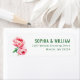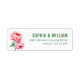Denna returadressetikett har en ren, minimalistisk design med två stora rosa peonior till vänster och elegant serif-typografi till höger. De mjuka rosa kronbladen kontrasterar vackert mot djupt gröna blad och skapar ett klassiskt och förfinat uttryck. Layouten är rymlig och låter varje element sticka ut tydligt, perfekt för formella tillfällen. Det övergripande estetiska uttrycket förmedlar grace och underdriven skönhet, vilket gör det idealiskt för bröllop eller sofistikerade evenemang.