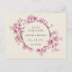 Elegantens blommigt sparar det postkort som innehåller en krans bestående av färgade blommor av rosa-körsbär-blommar över en elfenbensbakgrund. Dina uppgifter om bröllop ligger i andedräkten i ett djupt brunt färg. Lägg till din returadress och ditt personliga meddelande längst bak. Denna chic är underbar för ett firande i vår.