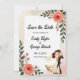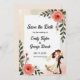 Den här blommigten med elegant vattenfärg sparar datumet inbjudan är perfekt för ett modernt bröllop. Den romantiska designen har en elegant vattenfärgsbild i ram med en blommigt med brud- och groombild och svart kalligrafi på vit bakgrund.