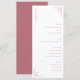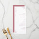 Denna eleganta meny för bröllop har en minimalistisk design med en mjuk rosa bakgrund och delikat kursiv typografi för ordet "Meny". Layouten är ren och organiserad och visar sektioner som Förrätter, Sallad, Huvudrätt och Efterrätt i feta serif- rubriker. Geometriska linjeteckningar ger en modern touch till den övergripande estetiken, medan färgpaletten med mjuka rosa och grå toner skapar en raffinerad och inbjudande atmosfär. Perfekt för formella middagar, kombinerar denna meny enkelhet med sofistikation, vilket gör den idealisk för bröllop eller exklusiva evenemang.