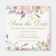 En elegant blommigt bukett av rosa peonier och elfenbensblommor i vattenmiljö ram denna vackra blommigt vår bröllop Spara datum magneter. Sage-löv:s sprit dekorerar mitt i den persikomatris med blommor som omger den vackra guld-typografin på dessa chic kvadratmagneter.