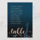 Lägg till stil till din bröllopsfest med denna enkla men stilrena bordskarta, som låter gäster hitta sitt bord. Funktioner elegant handskriven och blockbokstäver i rosa med en skur av konfetti på en lysande oceanfärg i blått som frammanar Medelhavet mot svart bakgrund. Anpassa med namnen på deltagarna och bordnummer.