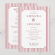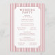 Det här bröllopsprogrammet har en elegant rektangulär layout med vertikal orientering, inramad av rosa och vita diagonala ränder på sidorna. Det centrala området visar en mjuk krämfärgad bakgrund som kantas av en dekorativ ram med utsirade hörn, vilket skapar ett klassiskt och sofistikerat utseende. Designen använder en harmonisk färgpalett med dämpade rosa, krämfärgade och djupa vinröda nyanser som inger värme och tradition. Typografin är tydlig och strukturerad, med anpassningsbara avsnitt för namn, ceremonidetaljer, datum och plats, vilket gör den perfekt för personlig anpassning. Idealiskt för bröllop kombinerar detta program formalism med en touch av charm och sätter tonen för en minnesvärd firande.