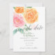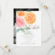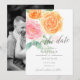 En charmig och delikat blomsterbröllopsinbjudan med er favorit förlovningsbild på baksidan. Denna design har stora akvarellrosor i orange och rosa, med gröna blad, överlagda med "spara datum" i grå kalligrafisk stil. Personifiera med er bröllopsinformation i grå typsnitt.