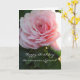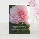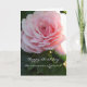 Ett vackert födelsedagskort med en mjuk rosa ros i fullt-blomma omgiven av lövliknande gröntar. Anpassa efter behov.