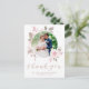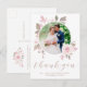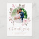 Tacka era bröllopsgäster med stil med detta eleganta vattenfärg blommande anpassade fototackkort med platt design. Denna designmall visar er bild på framsidan, infoldad i en blomsterkrans med handmålade blushrosa rosor och grönt på vit bakgrund. Under fotot i modernt skrivsätt står det "Tack" med era namn och bröllopsdatum för att anpassa. Baksidan av vykortet har ett anpassat meddelande och signatur, accentuerat med en bukett rosor. Designad av Susan Coffey.