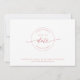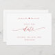 Berätta din bröllop-dejt med det vackra bröllop spara datum-kortet. Skriptdetaljer i modern skrift i rosa/ro guld faux foil både framifrån och bakåt över vit bakgrund. Tillbaka med den unika Spara datum frimärke/monogram med par namn. Rena och enkla stil. Vit och rosa. Samma design med rosa/ro guld med vit text är också tillgänglig. Område till bröllop webbplats, mer information eller/och meddelande till dina gäster (t.ex. "Kan inte vänta tills du ser dig där!").