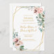 Denna eleganta rosa blommiga | bröllopsinbjudan är perfekt för din boho, rosa vår botaniska bröllopsmottagning. Designen har en guldpräglad ram åtföljd av en enkel akvarell persikofärgad champagnros, minimalistisk grön eukalyptus och en modern unik neutral, korallfärgad poppy vildblomma. Designen är en lyx, idealisk för ett klassiskt, elegant, delikat chic sommar-, höst- eller vinterbröllop. Vänligen kontakta oss om du har några frågor om produktens design; skål!