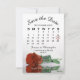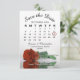 De vackra Spara datumkorten har ett fantastiskt foto av en enda lång rost orange eller brinnande färgad ro som reflekterar i vatten med vågar och krämer. Kortet innehåller en kalender med ditt bröllop-datum i ett hjärta. Snygg romantisk design.