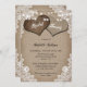 Rustic land inbjudningskort för möhippan med två brännhjärtor på en vintage som är täckt med vit blommigt snöre och sträng ljus.
