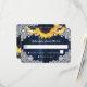 Elegant navy blue wedding RSVP card featuring sunflowers on a barn wood background adorned with delicate floral lace and string lights. Two burlap hearts at the back. Perfect card design to complement your navy blue rustic wedding party inspired by sunflower flowers.