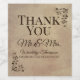 Dessa elegant vin flaska-märken har en rustik stil, en papper design för faux-parker som liknar en antikisk rulla i stil. Texten och bilder på dekalen är tryckta i en vacker chokladbrun färg. Texten kan vara personlig med era egna uppgifter om namn och bröllop. Uttrycket "Tack" är skrivet i ett stort, sofistikerat teckensnitt, följt av rubrikerna "Mr" och "Mrs" och den nya bridens och triomens efternamn i ett elegant. Datumet för bröllop trycks i grund. Två dekorativa, blommigt stil-designer visas i den översta högerna och grund lämnat delar.