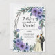 Den här elegantens inbjudan till blommigt med vattenfärg är perfekt för ett modernt bröllop. Den romantiska designen har en elegant vattenfärgsbild i ram med en blommigt med brud- och groombild och svart kalligrafi på vit bakgrund.