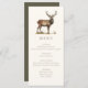 Jakt tema middagsmeny kort med en hjort illustration och elegant typografi, mörk olivgrön baksida och anpassad text. Perfekt för en lantlig middag, elegant bröllopsrepetition middag, jakt middag, jakt pensionärsfest eller jakt födelsedagsfirande.