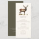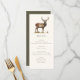 Jakt tema middagsmeny kort med en kronhjort illustration och elegant typografi, mörk olivgrön baksida och anpassad text. Perfekt för en lanmiddag, elegant bröllopsrepetition middag, jakt middag, jakt pensionär fest eller jakt födelsedagsfirande.