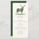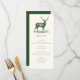 Jakttemat menykort i grönt med en illustration av ett hjorthuvud och elegant typografi, med grön baksida och anpassad text. Perfekt för en lantlig middag, elegant förlovningsmiddag, jaktmiddag, jaktpensionärsfirande eller jaktfödelsedagsfirande.