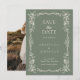Announce your special day with this elegant sage green Save the Date card, featuring a delicate vintage Victorian floral border hand-drawn in soft ivory. The refined typography and ornate botanical frame create a timeless, romantic aesthetic perfect for classic, traditional, garden, and estate weddings.