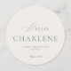 Create a refined and personalized dining experience with this elegant round wedding menu in soft sage green. Designed with timeless serif typography and modern calligraphy accents, this circular menu card beautifully displays each guest’s name on the front and the full dinner menu on the back.