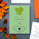Den här eleganten blir bröllopsinbjudan en perfekt för ett modernt höstbröllop. Den enkla designen har grönt höst löv med elegant svart och grönt typografi på en sidbakgrund i grönten.