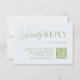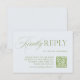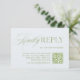 Den här förfinade OSA kort har sage grönt serif-typografi med ett flytande skriptaccent och en QR-kod för gäster som svarar på online. Perfekt för det moderna bröllop som blandar tidlös elegans med digital bekvämlighet. Innehåller utrymme för webbplatsen bröllop och en tidsfrist för svar. Perfekt för formella trädgårdsbröllop, sommar-firande eller traditionella evenemang med modern beröring. Helt redigerbart. Del av "Iris"-samlingen i Bröllop — klicka på samlingslänken på den här sidan om du vill bläddra i samordningen av delara som inbjudningar, menyer, skyltar med mera.