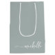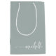 Elegant Modern Sagegrön Ömtålig Glam Monogram Namn Script Signatur Anpassad Personlig Presentpåse. Denna design med förnamnet i en vacker handskriven svansfont signatur typografi (eller kalligrafi) på sagegrön eller dammig grön bakgrund. Dessa är lätta att anpassa. Denna feminina presentpåse är bra för husvärmegåva, även för födelsedag, bröllopsdusch, bröllop, sweet 16 födelsedagsfest, baby shower, mors dag, för examensfestpresent och den är för tjejen som älskar unika eleganta saker.