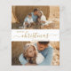 Modern, minimalistisk, Elegant "God jul"-skript 2 Photo Collage God Helgdag Flyer i guld och vitt. Den här snygga, tydliga, minimalistiska, två (2) familjekortmallen för fotokort för helgdag har ett söt-rutnätsfotokollage och säger "God jul"! Textskriptet "Jul" i hälsning är skrivet i en handskrift som snabbt byts ut mot svan. På baksidan ett foto och ditt meddelande. Hälsningskort för söt till din familj och dina vänner på Winter-Julhelgen.