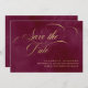Detta eleganta bröllop save the date-kort har virvlande modern kalligrafi i falskt guld, på en rik burgunderfärgad bakgrund.