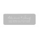 Chic, modern och enkel returadressetikett för bröllop med namn i handskrivet manusgrafi med vit elegant på en lätt grått bakgrund. Lägg bara till namn och adress. Enbart designad för dig av Lycklig Dolphin Studio.
