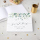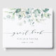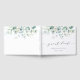Den här gästen bok från bröllop har färgade vattenfärgseukalyptus, botanisk grönt och ljusblå löv med modern kalligrafi.