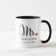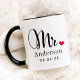 Personlig kaffe koppar för den nygifta Mr. och Mrs. har elegant svart manus och anpassningsbar efternamn och bröllop-datummonogramtext som kan vara personlig. Design innehåller en söt röd hjärtedetalj. Gör en underbar bröllop-gåva! Köp vår butik för den samordnande utformningen av mugg.