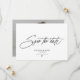 Med den här eleganten kan du spara datumkorten för att kunna meddela din speciella dag med stil och nåd. Utformningen har ett modernt skript för eleganten för det framträdande meddelandet "Spara datum", teckning med det flytande kursiva teckensnittet. Nedan visas parets namn, datum och plats i bröllop på ett bra sätt i ett enkelt men förfinat typsnitt, vilket ger en aning sofistikering. Om du vill ha ett mer personligt alternativ kan du använda fotodesignen med samma spara som dagen för att visa ett favoritfoto av paret, skapar kortet som verkligen är unikt och minnesvärt. Idealisk för par tittar för en kombination av modern elegans och personlig flust, sparar dessa datumkort tonen för en oförglömlig händelse. Oavsett om du väljer den minimalistiska textversionen eller versionen med ett foto, säkerställer de här korten att dina kära kommer att märka sina kalendrar för din stora dag i stil. Perfekt för bröllop, förlovningar eller speciella meddelanden. De lägger till en tidlös beröring till ditt bröllop-kontor.