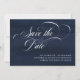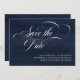 Detta eleganta bröllopskort för att spara datumet har virvlande modern kalligrafi i vitt på en rik, mörkblå bakgrund.