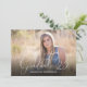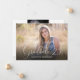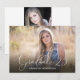 Detta examensmeddelande erbjuder en fotoram som fyller hela framsidan med den eleganta skrivstilstexten: Examen '26. Baksidan erbjuder en annan mindre fotoram och anpassad text för dina examensdetaljer.