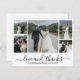 Modern, Elegant Script Bröllop 5 Photo Collage - tack för ditt kort i svartvitt. Minimalistisk, snyggt-bröllop-kortmall med fem (5) rutnätsfotokollage och ett "Kärlek och tack"-handskript med kalligrafi-dekorteckensnitt i svan. Anpassa ditt namn och tack för meddelandet. Om du behöver hjälp eller matcha objekt kontaktar du designern!