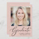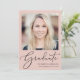 Gratulera till student med det studenten-meddelandet om rosa som innehåller "Student" i ett elegant-skript och hennes foto och namn, skolår och klassår i enkel modern typografi.