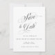 I den här inbjudan till elegant kombineras en ordlisterendering av Spara datum tillsammans med ett traditionellt stil-teckensnitt. Enkel att anpassa med din information om bröllop och lägga till ett foto på baksidan. Vackert!