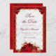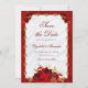 Det här lyxkortet blommigt bröllop spara datum har ett skript för elegant, röd ros som dekorerar ett guld-filigree ram och en vit satin och faux röd metallbakgrund. Checka ut samlingen för matchande produkter, eller kontakta mig genom Zazzle-Chattan för det speciella objekt som du är tittar för.