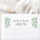 Den här returadressetiketten har en enkel framväxande grönt bladviner på varje ände av etiketten. I mitten kan du lägga till ditt namn och din returadress med anpassningsbar. Den här etiketten koordinerar med en bröllopsinbjudning som finns i affären... Laurel Lane Paperie.